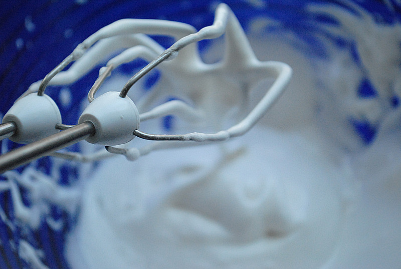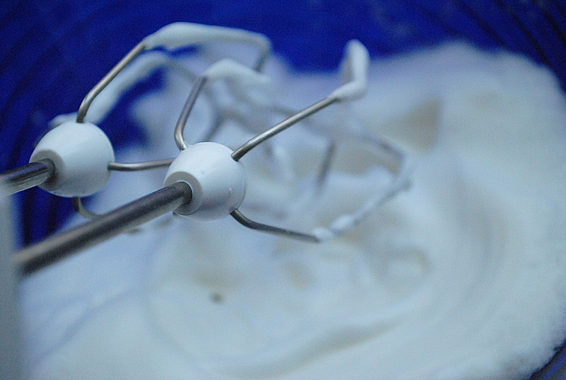 1) В стеклянной посуде взбиваем до устойчивых пиков яичный белок.