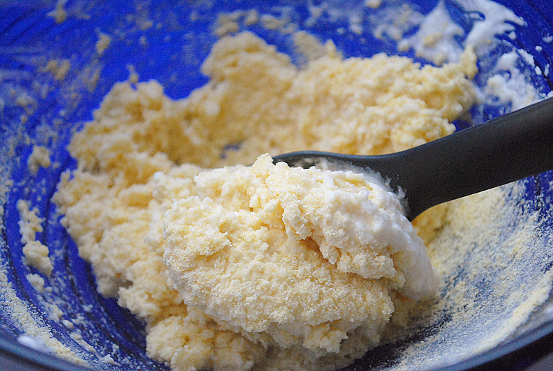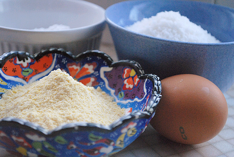 3)Теперь добавляем кокосовую стружку и кукурузную муку и перемешиваем ложкой до однородности .